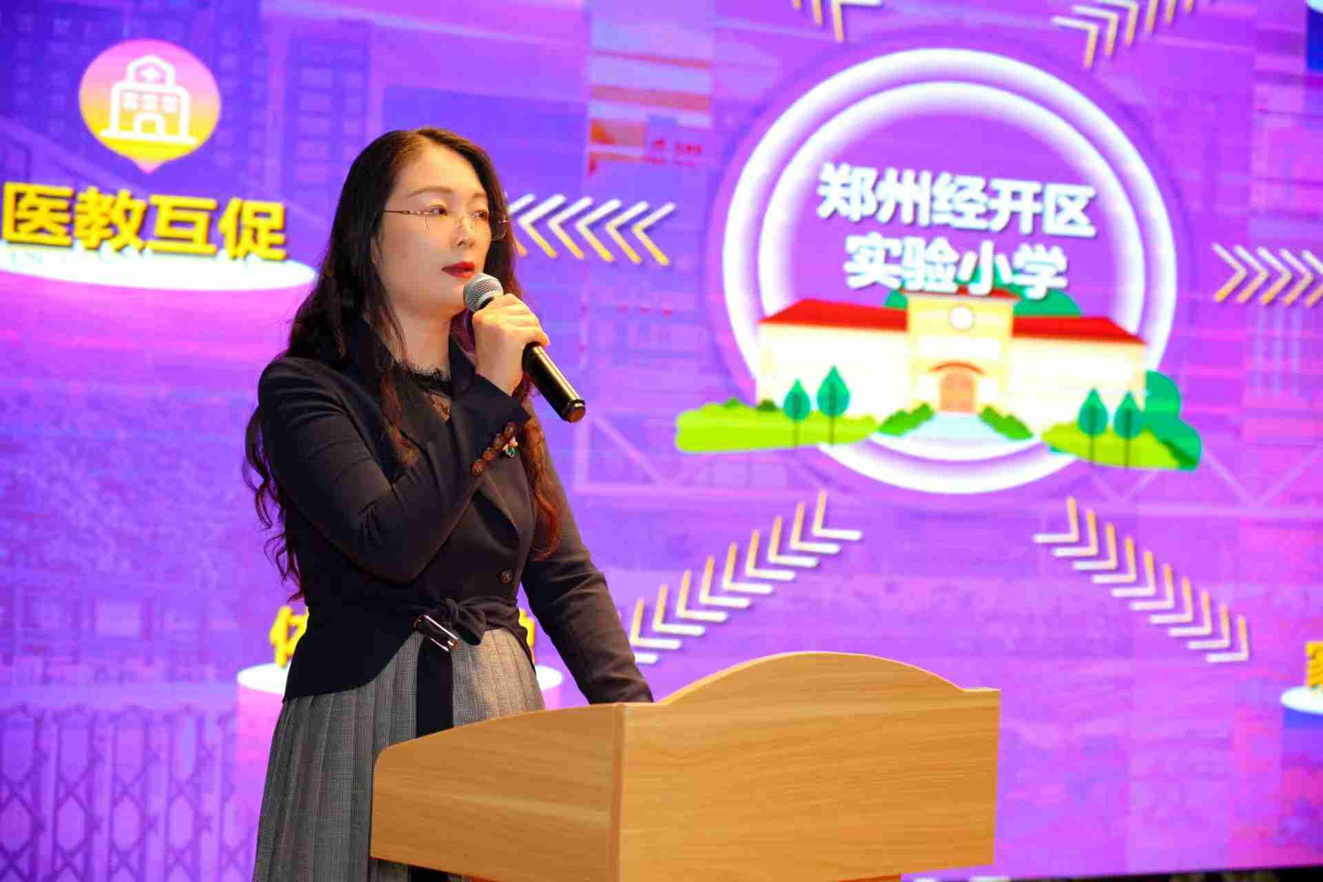 郑州经开区教文体局党委委员周旭锦发表讲话。她对“实创未来”教联体的成立表示热烈祝贺,指出教联体是响应国家政策、打破校园“围墙”的创新实践,并提出期望实验小学教联体做育人共同体构建者以链接资源、科学育人观引领者以赋能家长、协同机制创新者以畅通渠道,推动协同育人落地,为孩子们的成长筑牢根基,话语铿锵有力,为教联体未来发展指明方向。