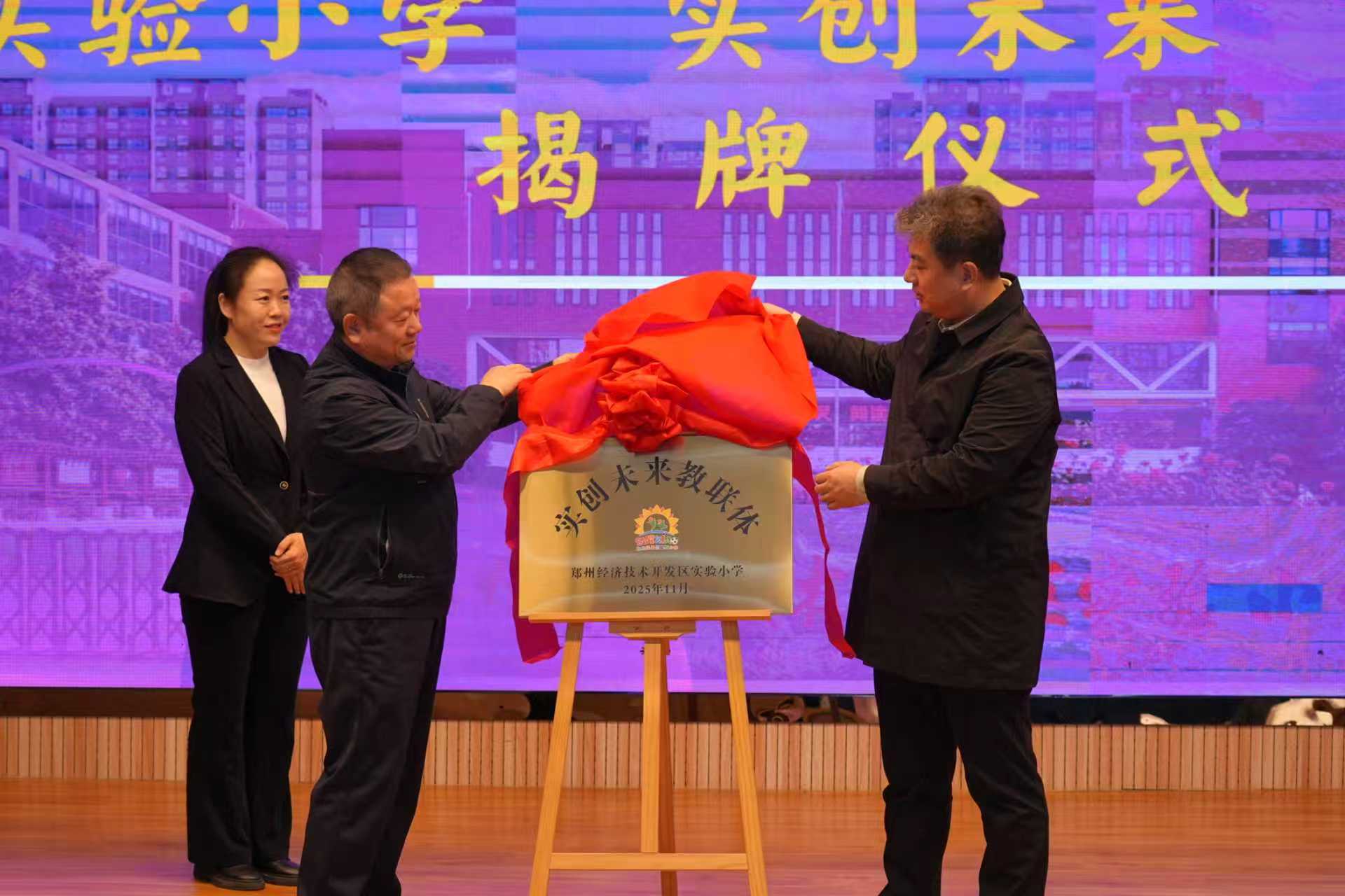 在全场瞩目下,工作人员稳步抬上揭牌架,河南财政金融学院马克思主义学院副院长段玉强与郑州市第七人民医院书记、院长尹磊共同为“实创未来”教联体揭牌。红绸缓缓揭开,“实创未来”教联体几个大字熠熠生辉,标志着经开区实验小学家校社协同育人新征程正式启航