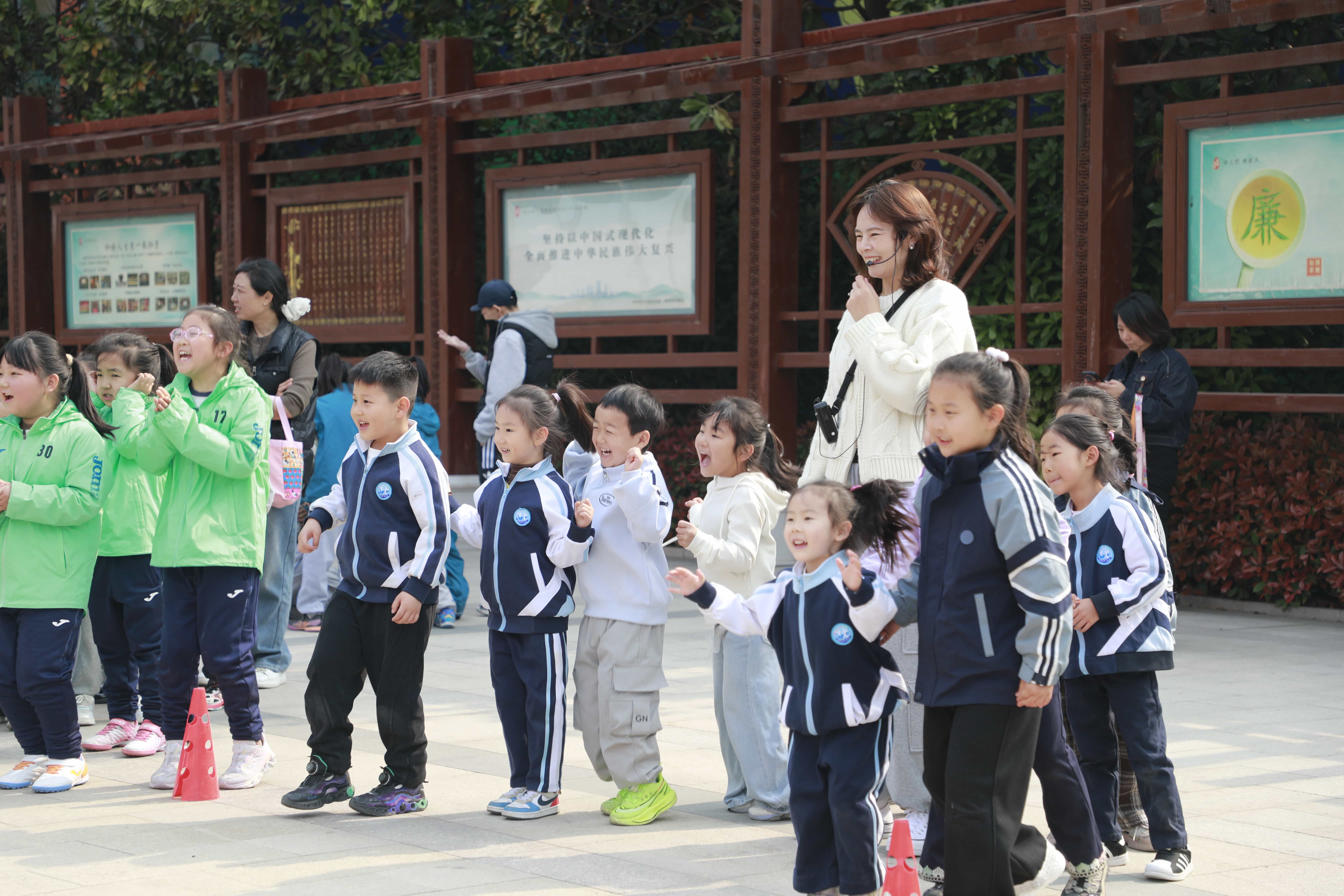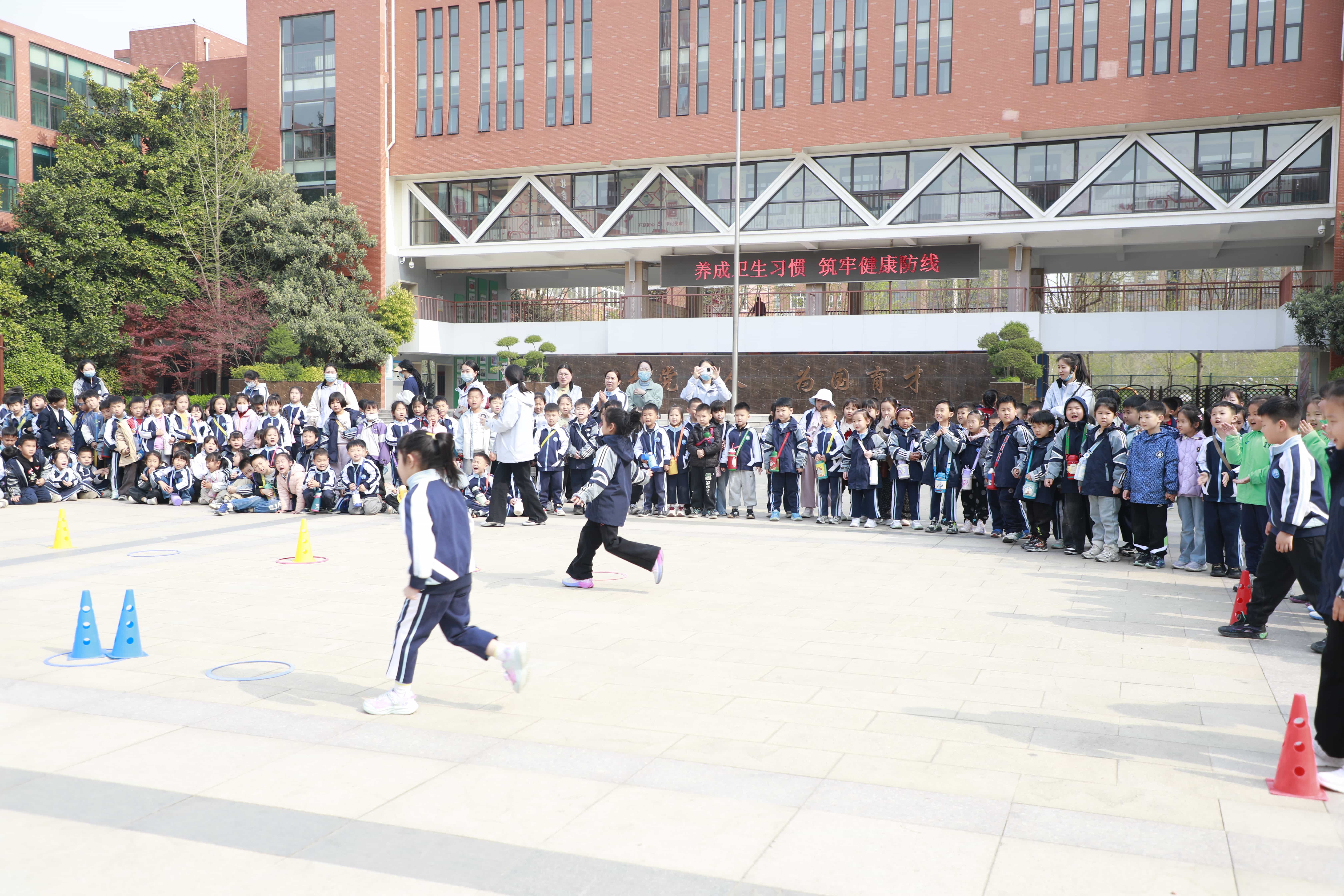 课堂沉浸式体验结束后,孩子们来到操场观看小学生课间操,整齐划一的动作、朝气蓬勃的精神面貌,让孩子们真切感受到了小学生的活力与风采。