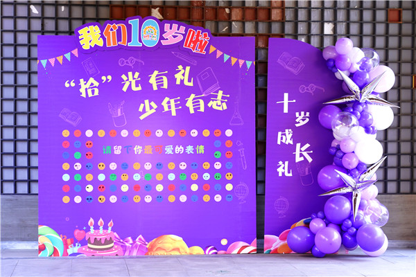 活动启幕前,报告厅外已洋溢着庄重而温馨的氛围。装饰一新的“成长门”静静矗立,仿佛在等待学子们跨越童年的界限;门口的“我们10岁啦”签到板前,孩子们手持画笔,认真勾勒出灵动鲜活的笑脸——每一笔线条都藏着童真,每一张画作都承载着对十岁的期待,以童趣与郑重兼具的方式,为自己的成长留下专属印记。