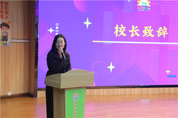 校长郭歌登台致辞时,报告厅内瞬间安静下来。她的话语既有对学子们十年成长的欣慰,也有对未来的真挚祝福;既提及了“拾光”的寓意——捡拾成长路上的点滴美好,更传递了红色传承的初心与“少年当立志”的殷切期许,温柔而有力的声音,为孩子们的十岁征程注入了温暖而坚定的力量。