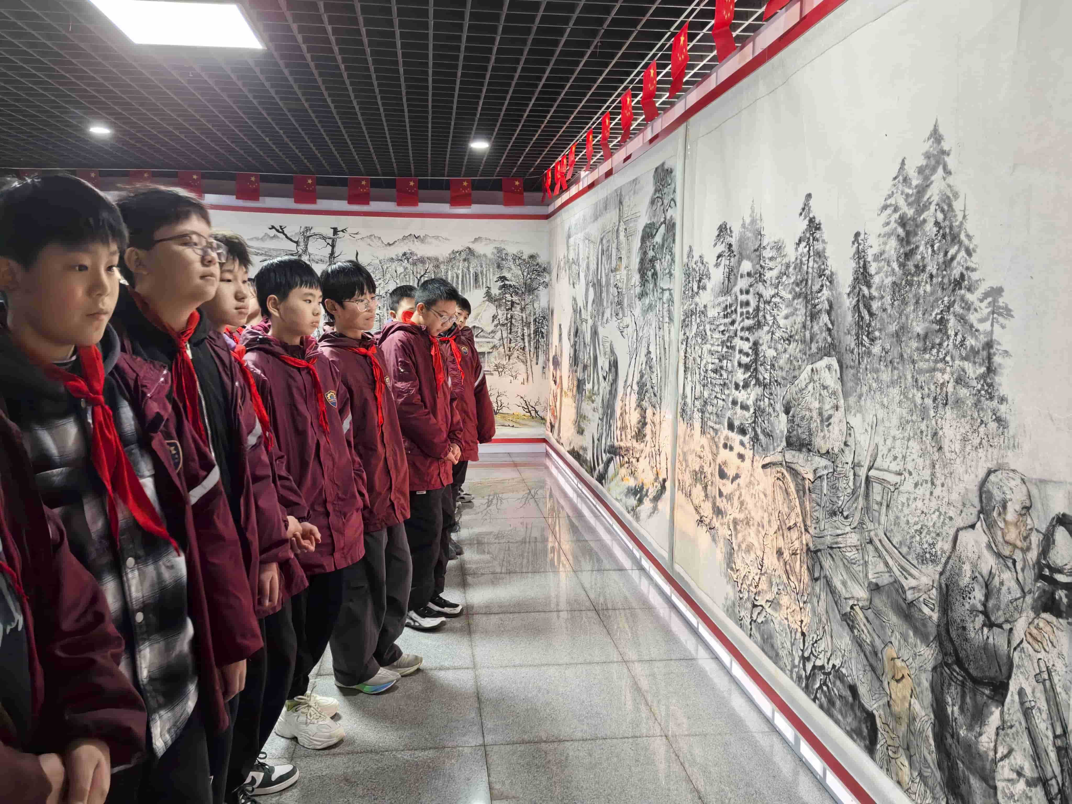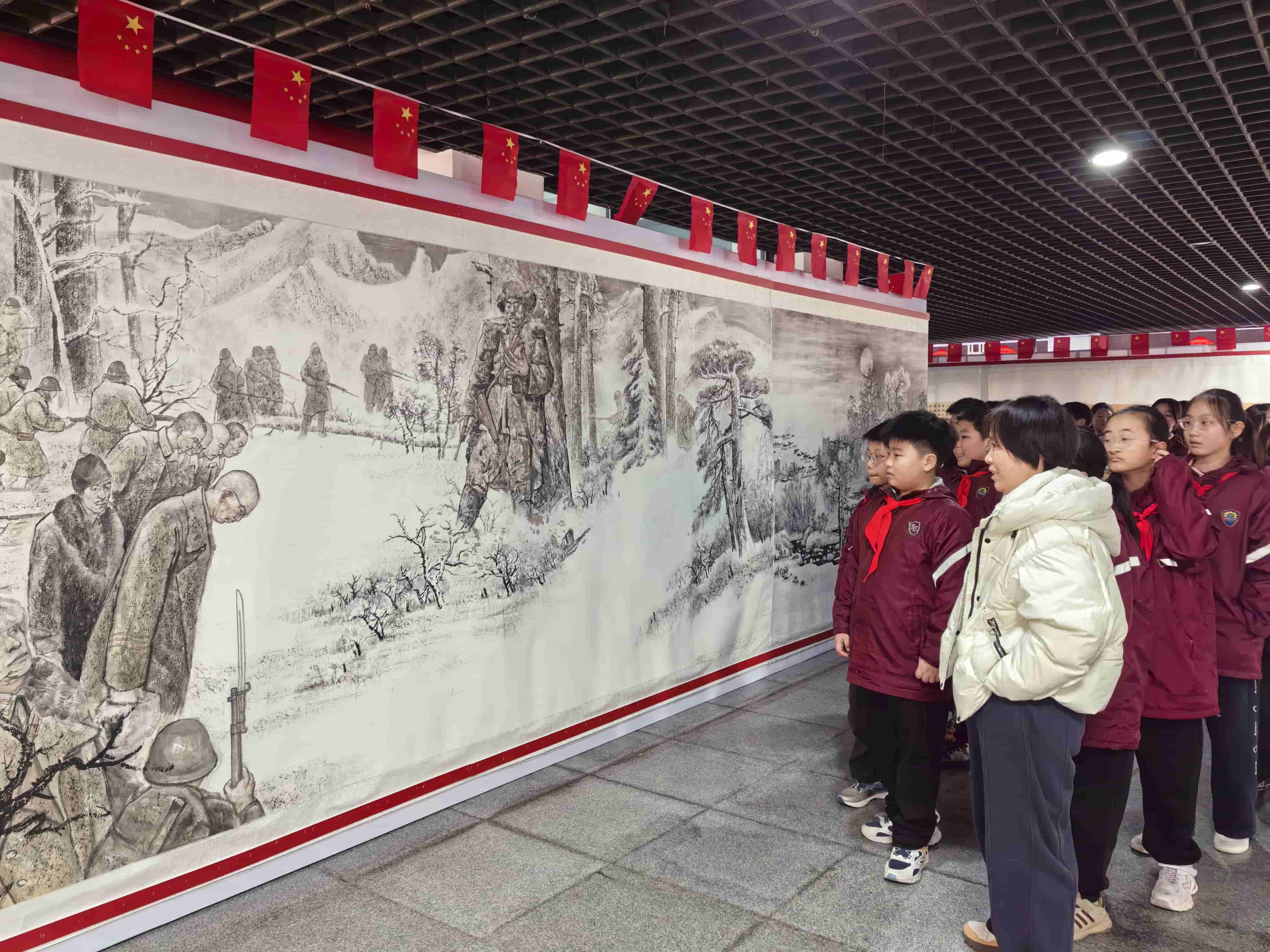 活动中,同学们在老师带领下有序走进展厅。百米长卷以细腻笔触,生动再现了杨靖宇将军投身革命、浴血抗战的光辉历程。讲解老师结合画作,用生动的语言深情讲述革命先烈的英雄事迹与家国担当。