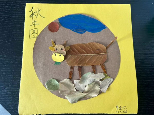 三、四年级的学生们则沉浸在“绘秋牛”的创意世界中。他们挥动画笔,绘制出一幅幅生动的秋牛图及树叶画,不仅展现了秋天的丰收景象,更深刻感受到了节气变化中的自然之美与农耕文化的魅力。