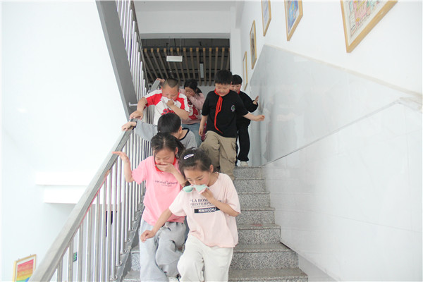 在逃生演练环节中,随着警报声响起,同学们手拿湿毛巾捂住口鼻,弯腰前行,在老师们的引导下,迅速有序地撤离到安全地带。
