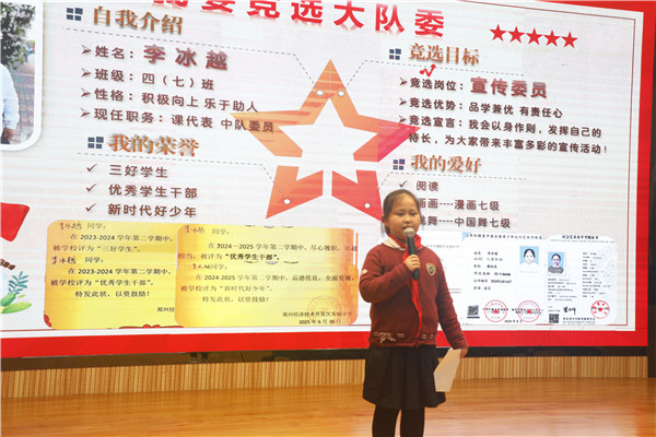 为充实少先队管理力量、选拔“有担当、有能力”的队员骨干,学校于 10月9日—10日恪守“公平、公正、公开” 原则,有序推进大队委竞选工作。经“自主报名—班级推选”层层选拔后,校级竞选在报告厅庄重举行,由上一届少先大队副大队长六一中队葛凌帆、康天泽主持。现场氛围热烈有序,候选人们神采奕奕:竞聘演讲时,结合精心制作的个人简介 PPT,清晰阐述荣誉经历、分享工作规划,满含服务决心;才艺展示环节缤纷多彩,舞蹈、歌唱、书法、吉他、双节棍、绘画、架子鼓等轮番上演,尽显多元素养;即兴问答中,从容应对老师提出的工作实际问题,展现责任意识与应变能力。
