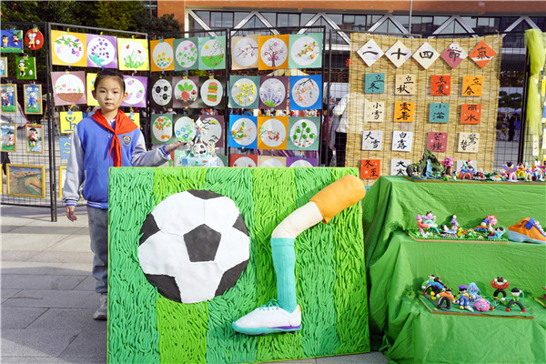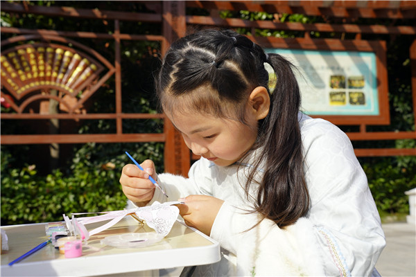 五三班的“钧瓷纹样手绘”摊位,则是一场“家乡非遗的匠心体验”。白色瓷盘坯、水彩颜料、细头画笔整齐排列,摊位后方的展板上,不仅有钧瓷实物图片,还有“钧瓷小知识”:“钧瓷是河南禹州特产,被誉为‘国之瑰宝’,特点是‘入窑一色,出窑万彩’。”孩子们化身“小小陶艺家”,先仔细观察展板上的钧瓷纹样,再蘸取蓝、紫、粉等颜料,在瓷盘上勾勒缠枝莲、云纹。不少孩子完成手绘后,还会主动阅读展板上的钧瓷历史,让文化体验不止于“动手”,更深入“入心”。