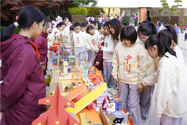 六年级“传统新表达・生活创想家”围绕毕业季和生活创造展开想象,有的班级专注“旧物改造”,将纸箱做成传统纹样收纳箱、旧T恤印上敦煌藻井图案;有的班级聚焦“校园文化”,还有的班级以“我眼中的实小”为主题,以树叶画、彩泥、手绘作品等多种形式展现心目中的校园。